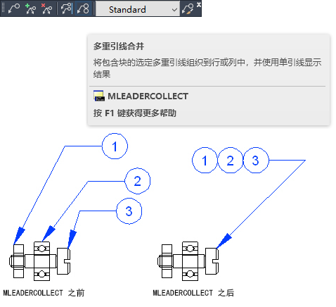 可以合并内容为块的多重引线对象并将其附着到一个基线。使用 MLEADERCOLLECT,可以根据图形需要水平、垂直或在指定区域内合并多重引线。