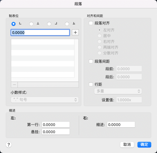 指定要用于段落的制表位和小数样式。