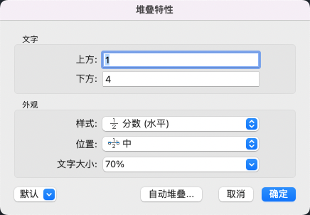 显示“自动堆叠特性”对话框。「自動堆疊」只會堆疊緊接在脫字字元 (^)、反斜線 (/) 或井字號 (#) 之前或之後的數值字元。要堆叠非数字字符或包含空格的文字,请选择要堆叠的文字,然后从文字编辑器快捷菜单中选择“堆叠”。