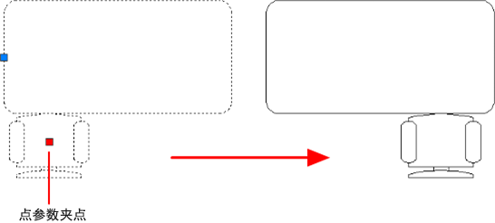 可以使用自定义夹点处理包含动作参数的块。例如,在以下块参照中拖动椅子上的夹点时,椅子也会移动。