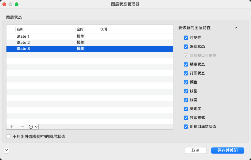 显示图形中已保存的图层状态列表。可以创建、重命名、编辑和删除图层状态。
