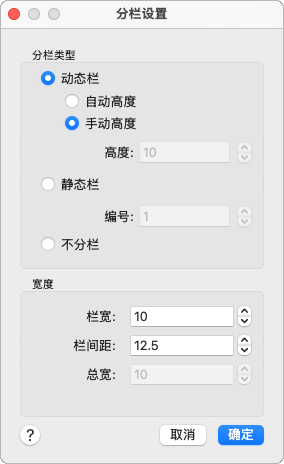 显示用于设置栏的选项,例如类型、栏数、高度、宽度及栏间距大小。