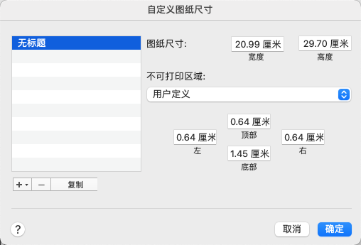 定义自定义图纸尺寸的页边距。