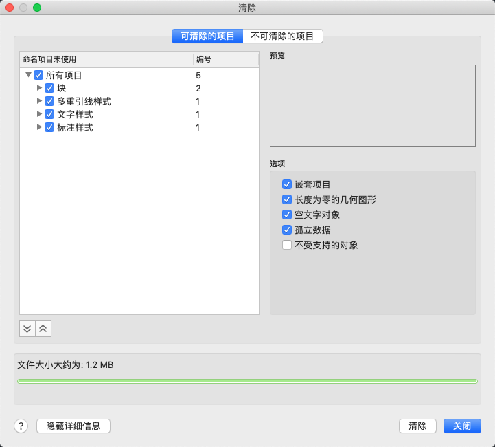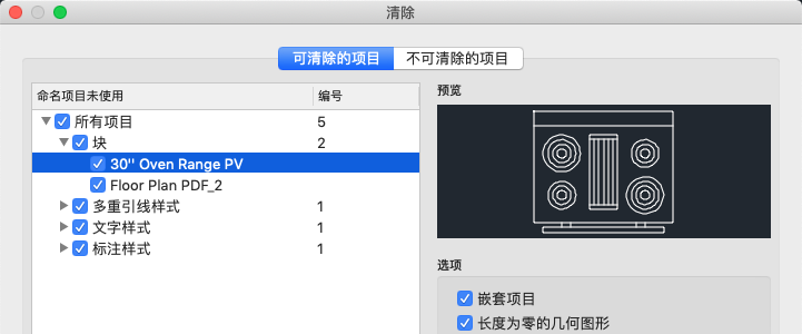 删除图形中未使用的项目,例如块定义和图层。 显示可被清理的项目。