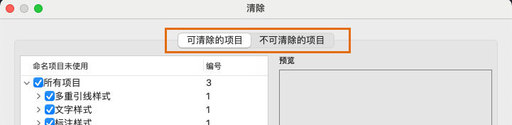 切换显示详细的对话框(包含可以清除的项目列表和预览)和具有清除所有命名项目的复选框的对话框。对话框的状态在 AutoCAD 的任务之间保持不变。