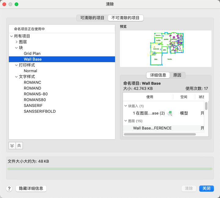 这些对象的大部分当前在图形中使用,或为不能删除的默认项目。当选择单个命名对象时,将显示无法清理该项目的原因。