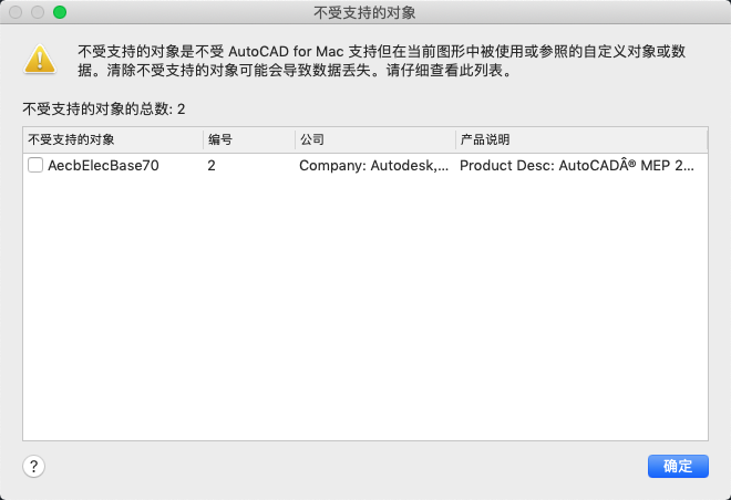 删除不受 AutoCAD for Mac 支持但用于在当前图形中进行参照的自定义对象或数据。选择“清除”后,将显示一个对话框,它会列出在当前图形中进行参照的不受支持对象。