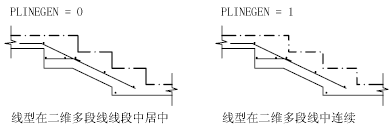 对于多段线,可以指定线型图案在每条多段线中是处于居中位置,还是连续跨越顶点。通过设置 PLINEGEN 系统变量可以执行此设置。
