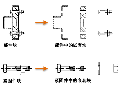 块定义中包含的块参照称为嵌套块。使用嵌套块可以简化复杂块定义的组织。