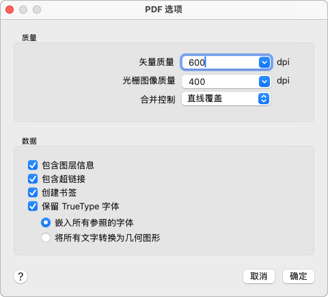 - 将 TrueType 字体嵌入在 PDF 文件中,这样便不需要在 PDF 查看器上提供它们。如果不选择此选项,PDF 查看器将使用替代字体。