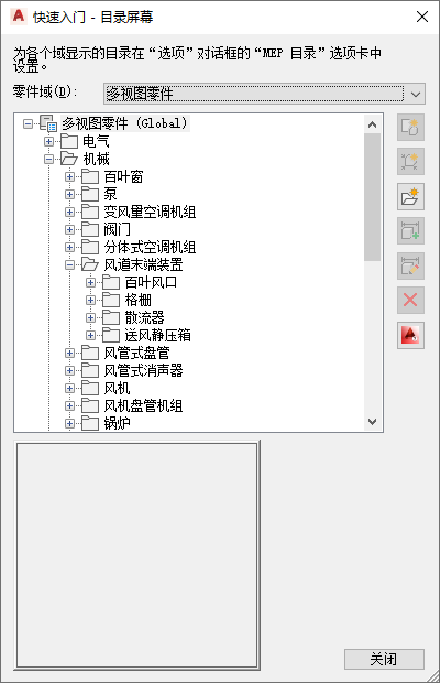 启动构件编辑器时,将显示“快速入门 - 目录屏幕”对话框。该任务特定的对话框可充当一个开关,能使您快速访问不同的工作环境。“快速入门 - 目录屏幕”对话框包含一个零件目录浏览器和一个图标栏。从“选项”对话框中的“MEP 目录”选项卡上指定的已加载零件目录列表中选择一个目录。若要了解有关零件目录以及如何在目录中存储零件的详细信息,请参见“零件目录的基本内容”。