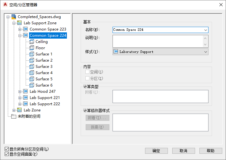 3. 在“空间/分区管理器”中,选择“显示所有分区及空间”和“显示空间曲面”。