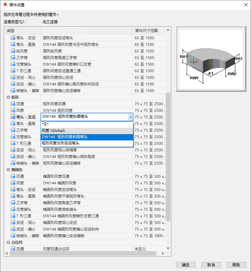 配置特定规格的布管系统配置时,适当的管件会自动插入到风管布局中。
