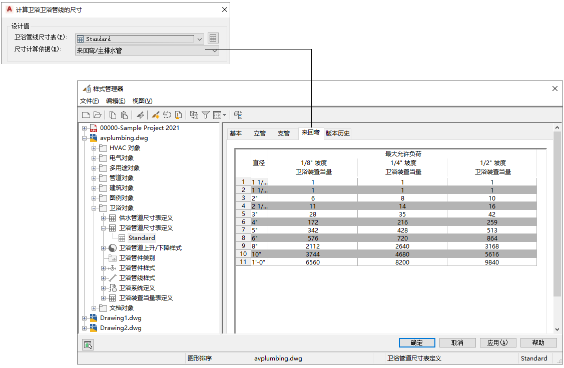 大多数卫浴系统都可以在包含多个楼层的建筑中找到。建筑中的每个楼层通常都绘制在单独的一张图形上。如果计算尺寸的卫浴系统穿越多个楼层,必须从最高楼层开始向下分别计算各个图形的卫浴管线尺寸。然后在计算较低楼层上的卫浴管线尺寸时,可以参照较高楼层中的各个计算值。有关详细信息,请参见“计算多个楼层卫浴管线尺寸的步骤”。