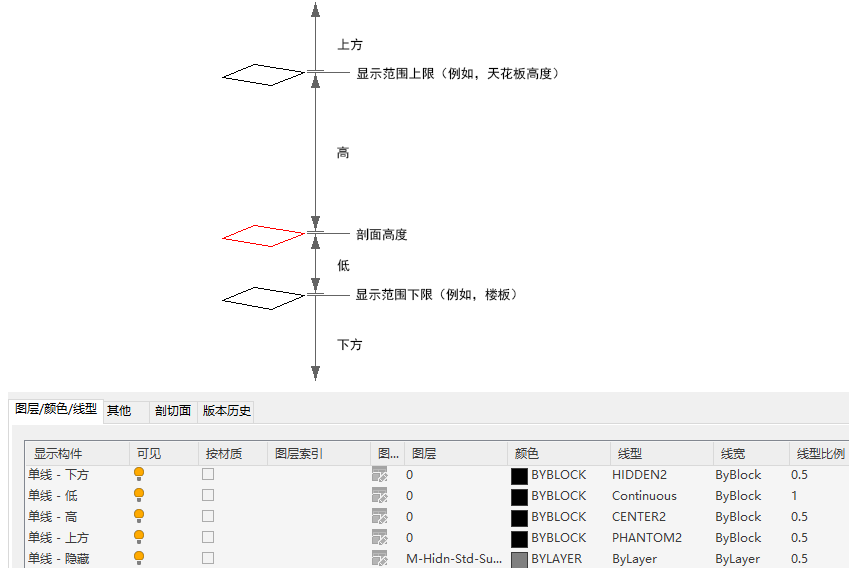 等于或低于此范围但是高于剖切高度的对象将使用“高”显示构件进行显示。