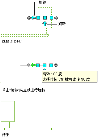) 旋转夹点沿夹点指示的方向将 HVAC 内嵌零件、风管管件和接头旋转 180 度或 90 度。