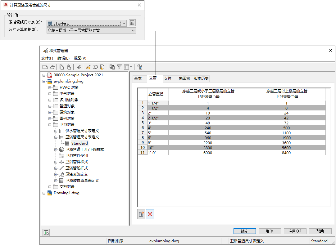 将卫浴管路定义为穿越三层或小于或多于三层楼层的立管时,管道模块将使用卫浴管线尺寸表(管道尺寸表)中“立管”选项卡上的信息执行尺寸计算,该尺寸表定义可在“样式管理器”中找到。