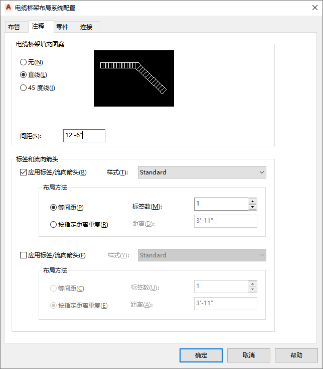 在绘制电缆桥架管路时,可以指定要为其添加的标签或流向箭头。还可以指定要应用的填充图案。可以指定垂直线或 45 度线以及要使用的线间距。