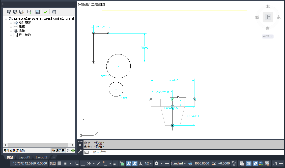 选择创建或修改参数化零件时,构件编辑器使用参数化构建环境。以下示例中的构件编辑器显示了矩形风管到圆锥形接头 T 形三通的连接。有关详细信息,请参见“启动构件编辑器”。
