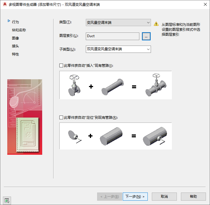 - 创建基于块的零件或将零件尺寸添加到零件族。向导模式可指引您完成定义以下各项的过程:零件行为、单个零件尺寸、用于表示每个零件尺寸的 AutoCAD 块、帮助进行零件选择的预览图像、零件接头以及特性集信息。有关详细信息,请参见“启动构件编辑器以创建基于块的多视图零件”。