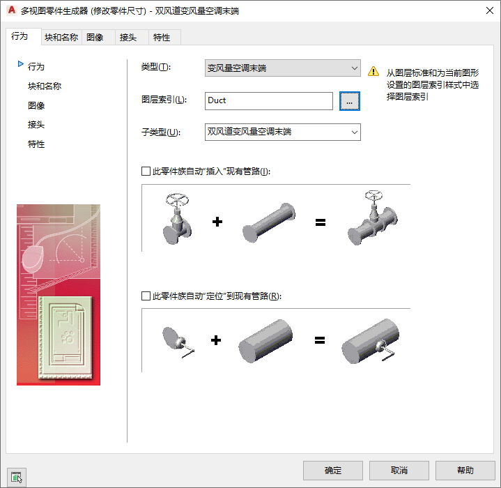 - 可修改基于块的零件。提供下列各项的选项卡:零件行为、指定的块和名称、预览图像、零件接头和指定的特性集信息。可随时修改一个或全部选项卡。有关详细信息,请参见“启动构件编辑器以修改基于块的零件”。