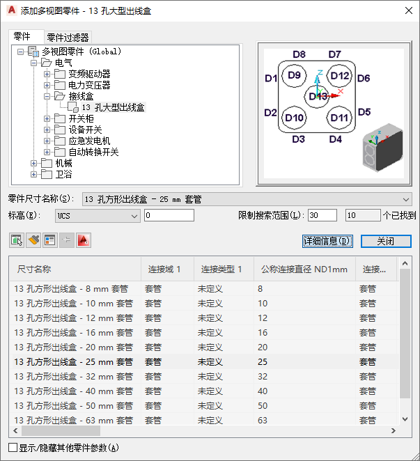在“添加多视图零件”对话框和“修改多视图零件”对话框中,也可以使用“零件过滤器”选项卡指定零件特性,以便查询零件族从而找到特定零件尺寸。可以通过单击“详细信息”来查看零件族中可用的零件尺寸。可用的零件尺寸在一个易于导航的零件尺寸表中显示。选择“显示/隐藏其他零件参数”可显示表中的所有参数。