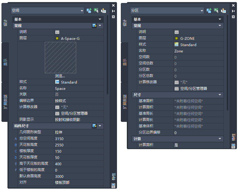4. 若要查看计算结果,请单击一个空间或分区,然后单击“特性”选项板上的“扩展数据”选项卡。