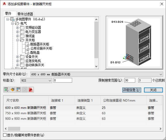 可以使用“电气”工具选项板组的“设备”工具选项板上的工具添加电气设备。选择一种工具,使用“添加多视图零件”对话框选择零件并配置其特性,然后将该零件添加到图形中。