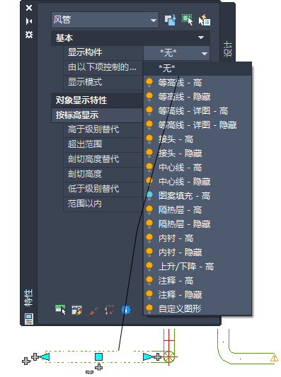 用户可以配置这些显示构件,以显示或隐藏下列 AutoCAD MEP 2027 工具集 对象(在与楼层平面和剖切面相对的位置):