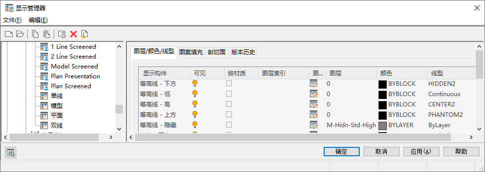 可以使用样式管理器或显示管理器配置基于标高的显示构件。以下示例显示了启用“按标高显示”功能后,显示管理器中的轮廓显示构件: