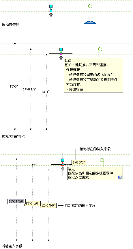 在侧视图和等轴测视图中将 HVAC 多视图零件和风管管段连接到现有风管管路时,可以使用标高夹点 () 来修改 HVAC 多视图零件和风管管段的标高。HVAC 多视图零件上的标高夹点显示在其插入点和接头点处。使用风管管段上的标高夹点可修改相对于管段的顶部、中心线或底部的标高。
