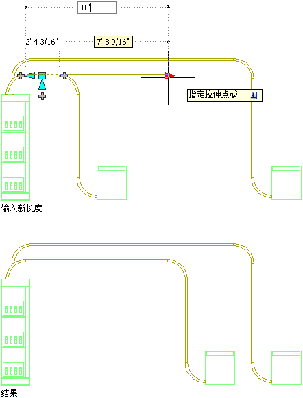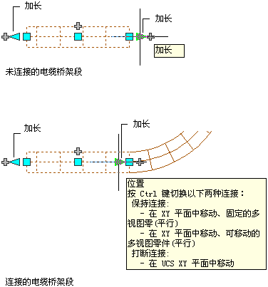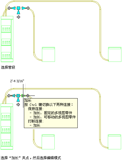 ) 修改电缆桥架和套管段的长度。由于这些夹点将段约束到其当前角度,因此它们特别适用于修改您已放置的管路的长度。