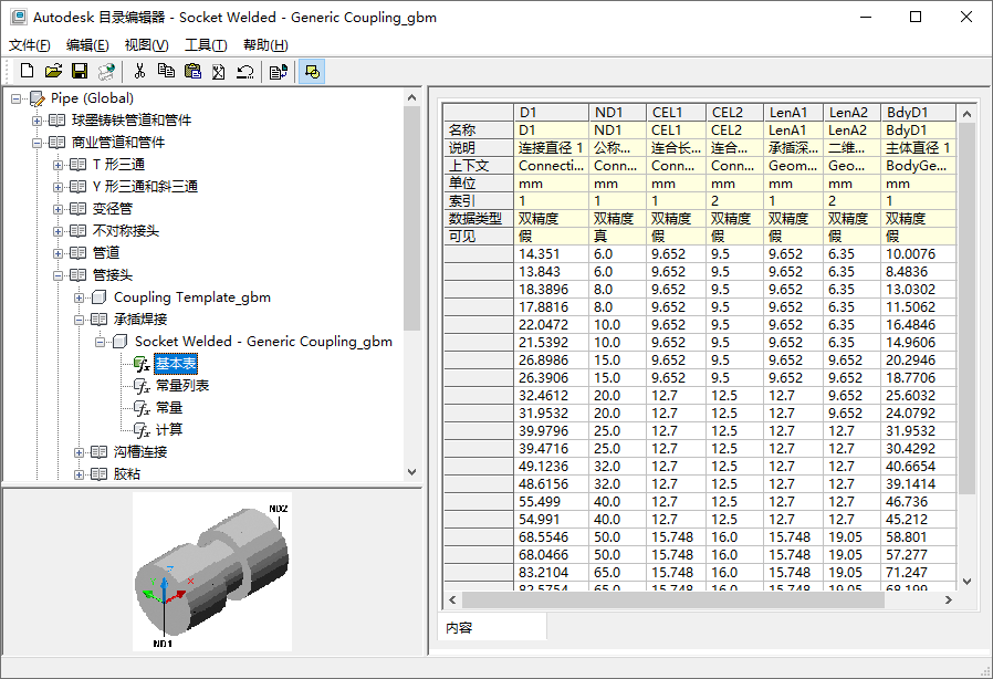 管道零件目录包含数千种尺寸的管道零件。管道域包括下列零件类型: