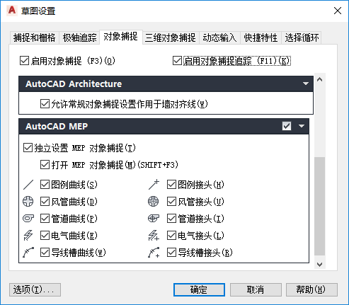 - 在“草图设置”对话框中,单击“对象捕捉”选项卡,然后向下滚动到“AutoCAD MEP 2027 工具集”。