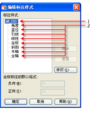 与绘图标准关联的标注样式由基准标注样式(图中的 1)和子样式(图中的 2)组成,基准标注样式定义了用于该标准的标注的基本设置,子样式明确定义了用于不同标注类型的样式。在大多数情况下,子样式与基准样式相同。在某些情况下,当需要在标注类型上强制实现某个唯一的特性时,标注样式的默认设置中至少有一个设置不同于基准标注样式。