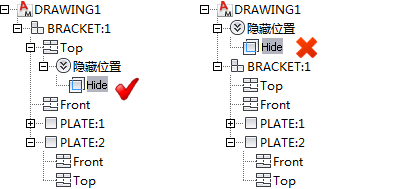 在启用了 Mechanical 结构的工程图中,隐藏位置在 Mechanical 结构中的位置很重要。