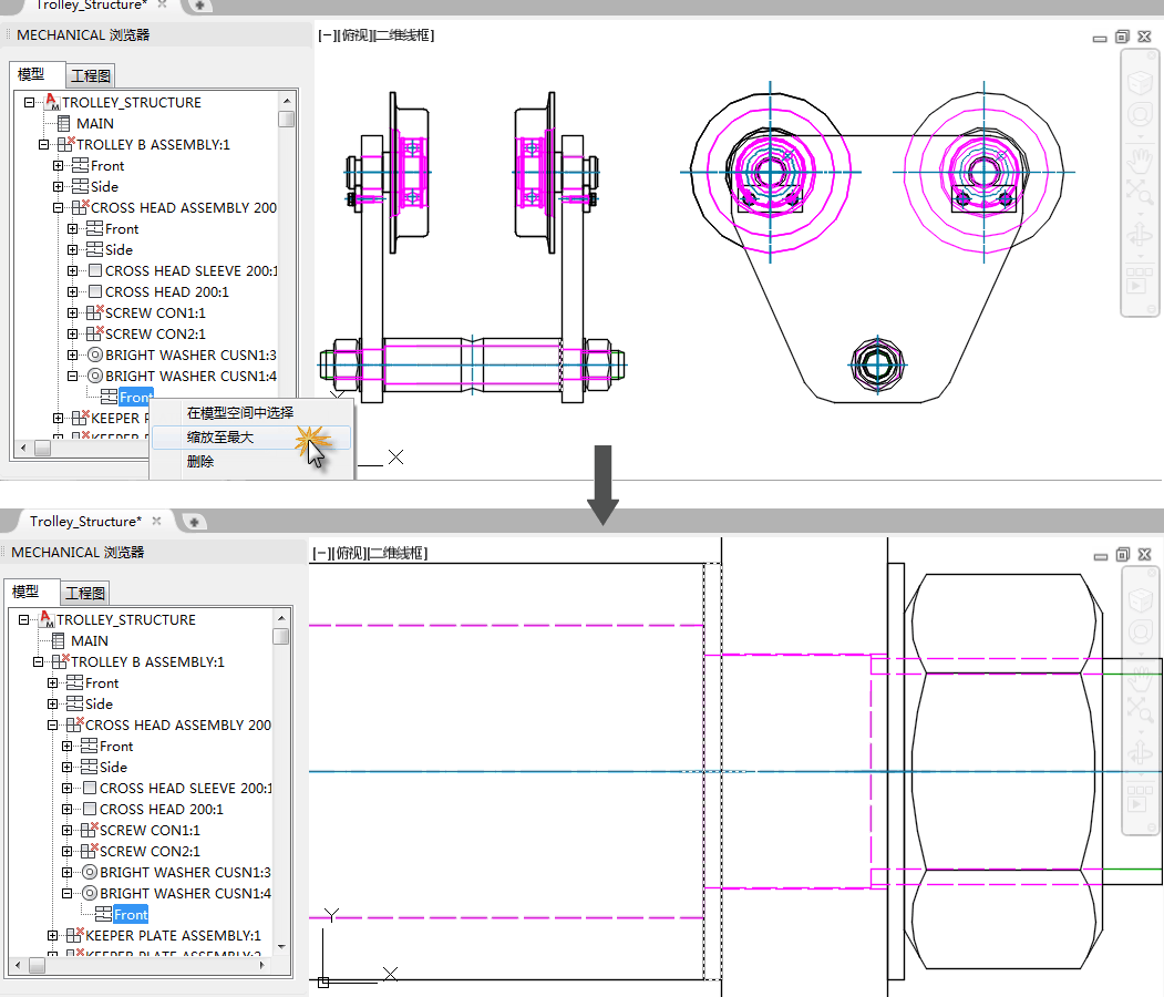 在 Mechanical 浏览器的零部件、零部件视图或文件夹上单击鼠标右键,然后选择“缩放至”时,绘图区域将最大限度地显示相应对象。