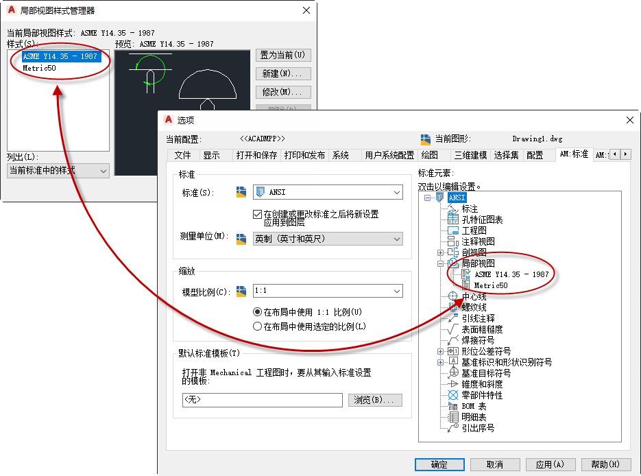 仅 AutoCAD Mechanical 工具集局部视图样式可以继承绘图标准主设置的文字和引线设置。