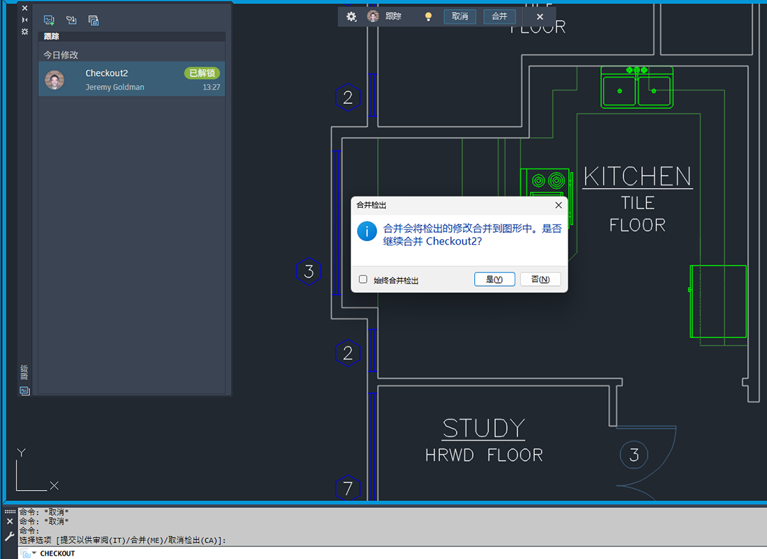 步骤 4:具有已打开图形并具有读写访问权限的协作者会在图形中收到通知,告知协作者已提交更改。然后,他们可以查看更改并决定是否将它们合并到图形中。