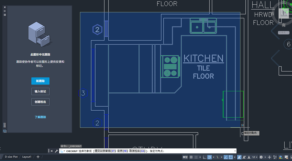 步骤 2:第二位协作者启动 CHECKOUT 命令,然后选择并确认图形中要检出的部分几何图形。