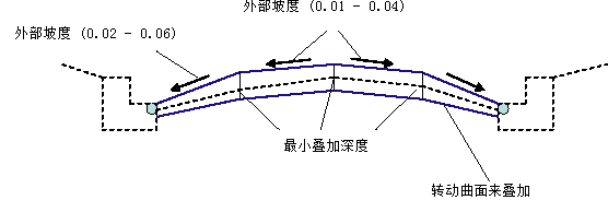 叠加曲面底部将通过按“叠加深度”值偏移所需的完工坡面(从左边界点到新路拱点到右边界点)来计算。