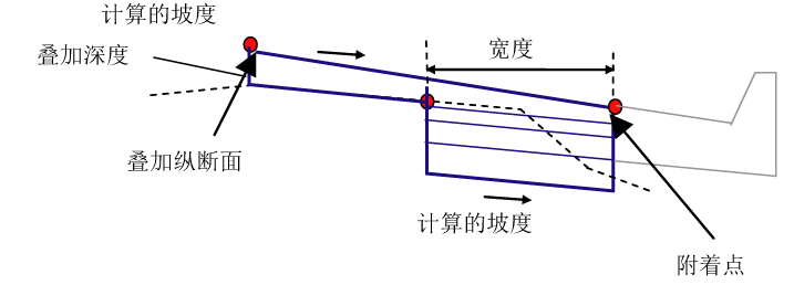 附着点将确定加宽部分外侧边缘的偏移和高程。加宽部分内侧边缘以及叠加部分内侧边缘的位置将使用给定的宽度和坡度来确定。路线可用于替代给定的数值宽度。如果给定了叠加纵断面,则将计算叠加部分内侧边缘处的纵断面高程与附着点之间的坡度。