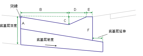 将基于输入参数“标注 A”到“标注 F”的标注插入路缘和边沟连接。所有标注都必须为非零的正值。如果给定非零的“底基层深度”,那么底基层将被插入到路缘后部,并延伸至“底基层延伸”宽度。底基层接近于路缘后部的底部,如图所示。
