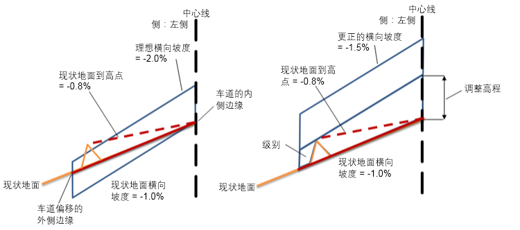 注: 是加上还是减去坡度公差取决于哪一项将使原地面横向坡度的值与理想横向坡度更接近。