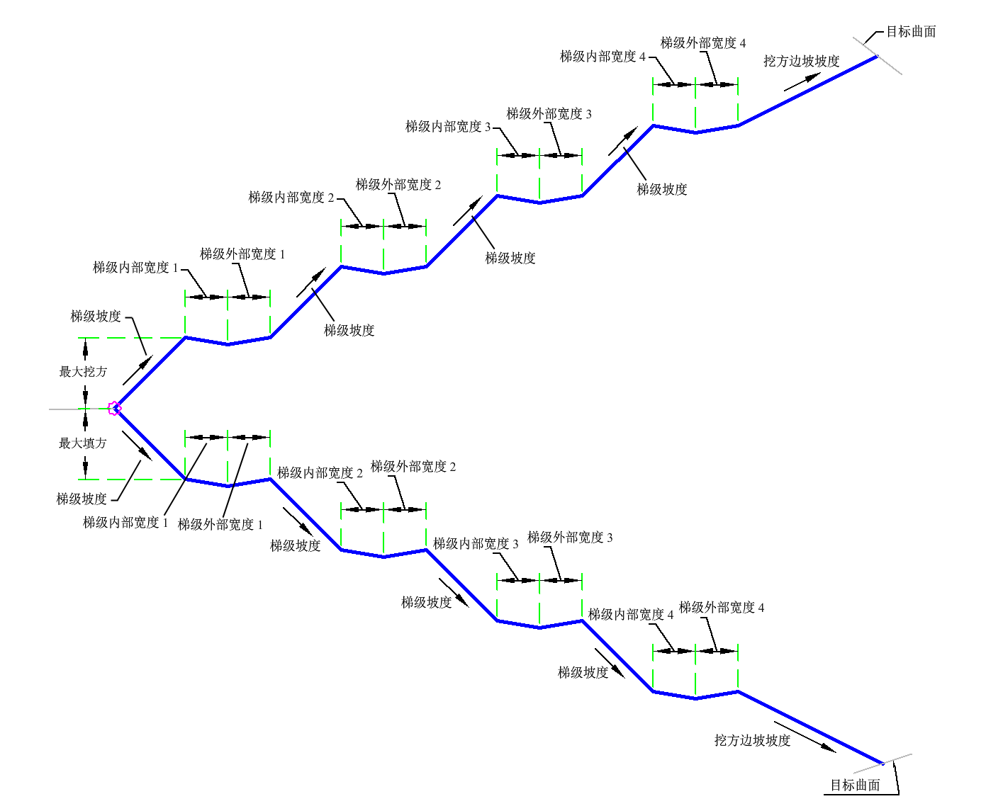 您可以定义各梯级的洼地宽度和深度。至目标曲面的最后一条边坡坡度可能不同于梯级坡度。