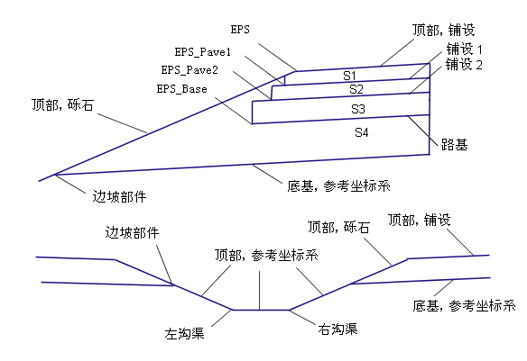 铺装的路肩将采用为基准路线的超高定义中的左侧和右侧内部路肩坡度而定义的坡度。这些坡度将从行车道内侧边缘向内应用。底基层曲面将采用与完工坡面相同的坡度,并向内扩展到与沟渠坡度的交点。