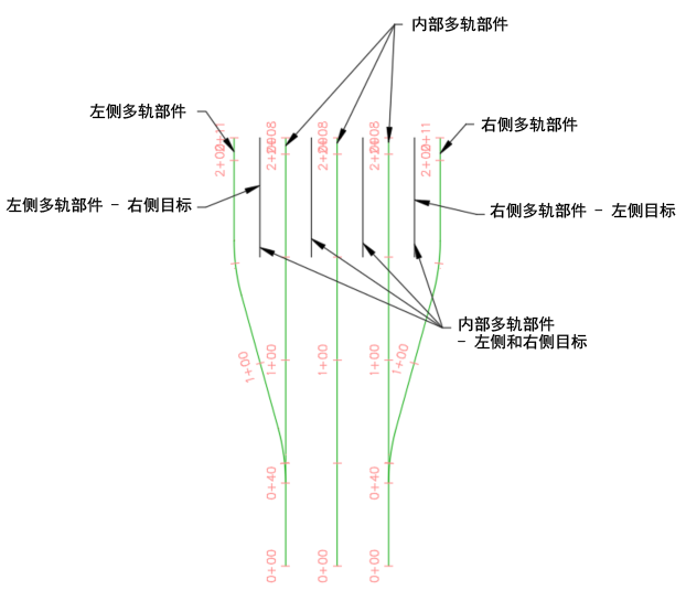 在布局模式中,此部件显示包含轨道、枕木、粗碴、细碴和边坡的连接。
