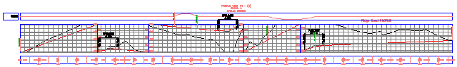 将创建新的纵断面图。请注意,由于在步骤 7 中指定了较短的最大高度,因此纵断面图栅格会短于图形中的其他纵断面图。为了适合较短栅格中的纵断面,已将纵断面分为两个段。由于“分段处”设定已在步骤 6 中设置为布局 (1),因此红色布局纵断面的完整长度和高程均可见。请注意,纵断面图的中间有一个垂直轴来显示两个分段的高程。