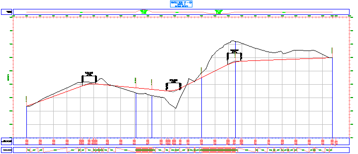 纵断面图 PV - (3) 顶部的数据标注栏将显示初始路线中的水平曲线的位置。蓝色竖线穿过纵断面图栅格,以标记每条水平曲线的起点和终点。底部的数据标注栏可以注记主要桩号处的两个纵断面的高程。