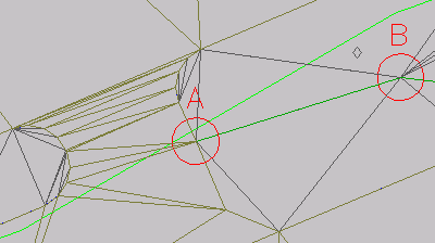 图标将显示在第一行中。该图标指示建筑物地基要素线在此点也有交点。如果两条要素线在公用顶点相交,则两个顶点必须共享同一的高程值。此点处两条要素线的高程由最新编辑要素线确定。在以下图例中,公用顶点位于圆 A 中。